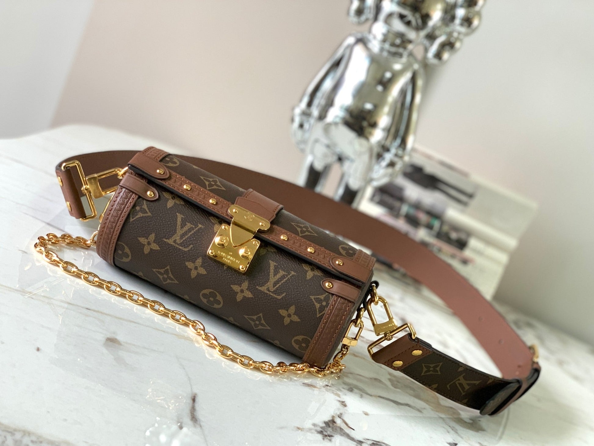 This structured Louis Vuitton Papillon Trunk reimagines the classic LV trunk in a compact size, finished in Monogram canvas and leather accents.